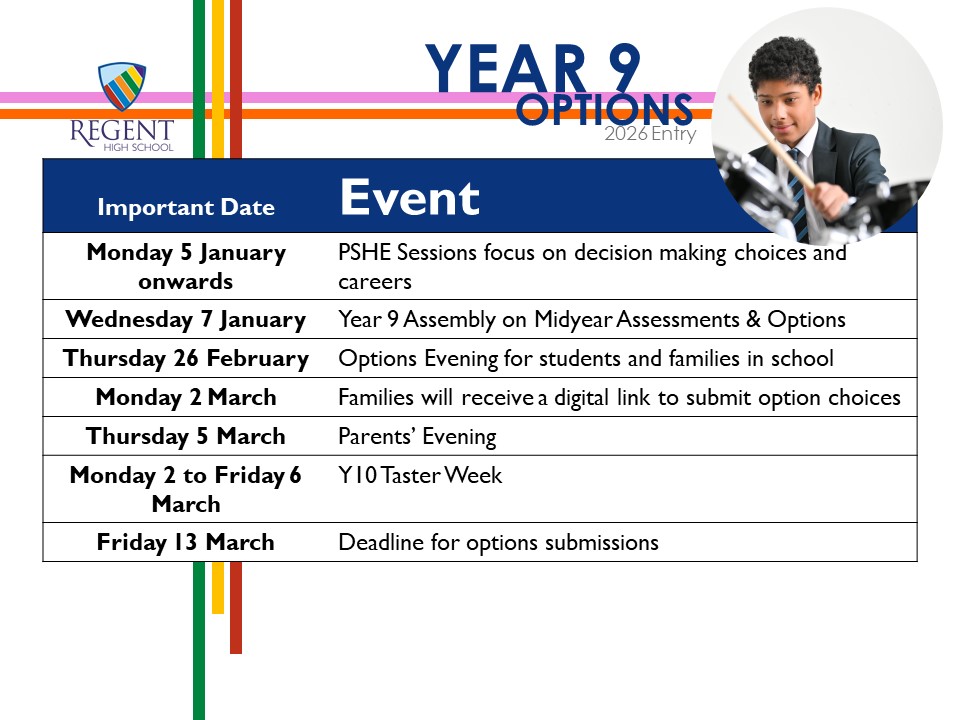 This page contains information to support Year 9 students in making their Key Stage 4 options choices. Please begin by looking at the timeline for this year: